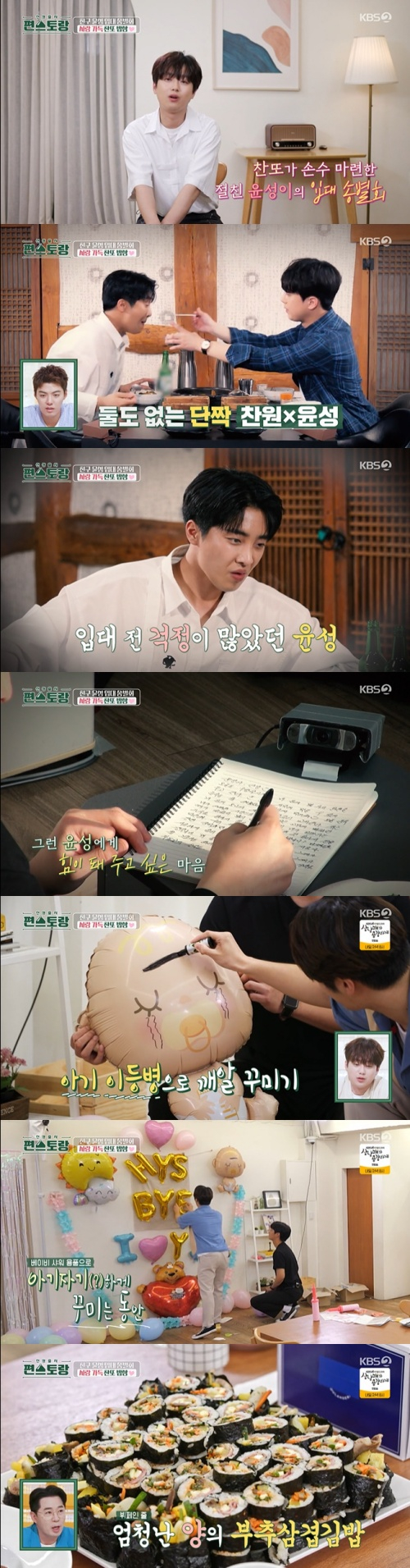 이찬원은 파티를 위한 김밥 28줄, 밥솥 식혜는 물론 갈비찜까지 능숙한 요리 실력으로 모두를 감탄하게 했다. 미리 준비해둔 갈비찜과 김밥에 윤성이 가장 좋아한다는 짜장밥까지 준비한 가운데 윤성이 도착했고, 부엌 테이블 뒤에 숨어있던 친구들은 윤성이 도착하자 한 번에 튀어나오며 경례와 군가를 선사해 그의 어안을 벙벙하게 했다.