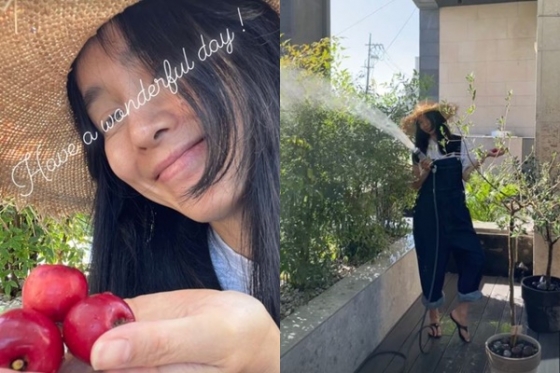 사진에는 홈 가드닝에 한창인 정혜영의 모습이 담겨 있다. 정혜영은 청멜빵 의상을 입고 사랑스러운 매력을 발산해 시선을 모은다.