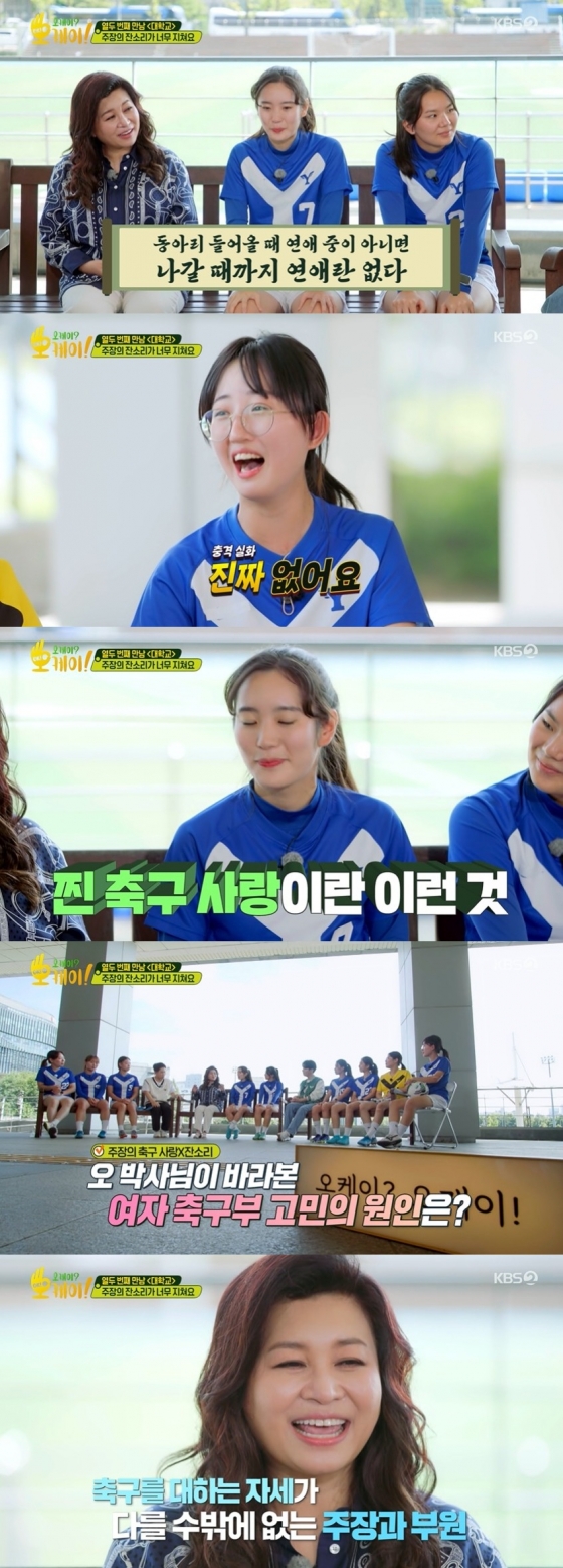 이날 여자 축구부 팀원들은 열정 많은 주장에 대한 고민을 털어놨다. 4년째 축구 동아리를 맡고 있는 주장 고민정이 소개됐다.