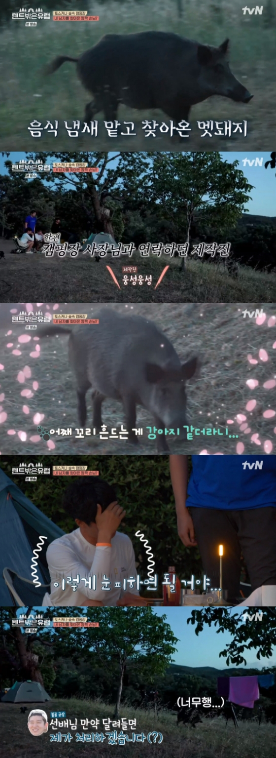 '텐트 밖은 유럽'에서 유해진이 캠핑장에 나타난 멧돼지에 침착한 모습을 보였다.