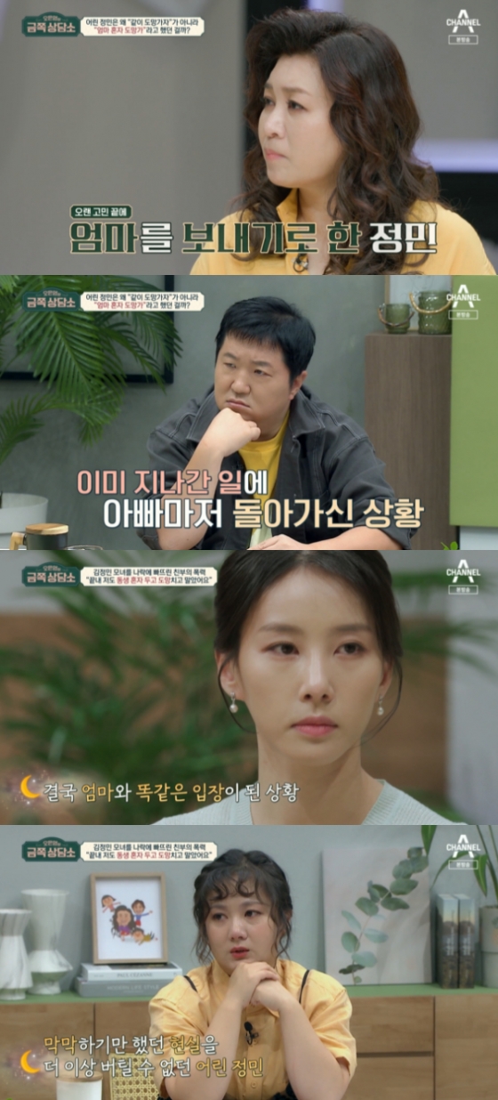 김정민은 "저희 때문에 고통을 받고 산다고 생각하셔서 엄마를 위해서도 있지만 저도 너무 고통스러우니까 그걸 매번 봐야 하고 '이걸 그만 보고 싶다'라는 게 크고 엄마가 스스로는 갈수 없는 것 같으니 내가 얘기를 해줘야 한다"며 엄마에게 도망치라고 말한 이유를 밝혔다.