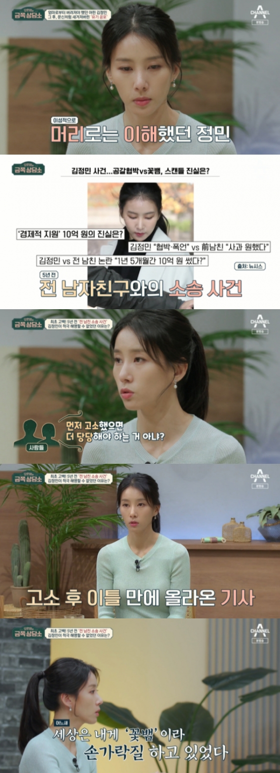 한편 김정민은 5년 전 남친과의 소송사건에 대해 이야기했다. 김정민은 "전 남친 소송사건을 거의 1년간 재판했다. 제가 먼저 고소를 했다. '먼저 고소했으면 더 적극적으로 해명하고 당당해야 되는 거 아니야?' 할 텐데 고소증 접수하고 법원에 가지도 않았는데 2~3일 만에 기사가 나더라"라며 당시의 상황을 전했다.