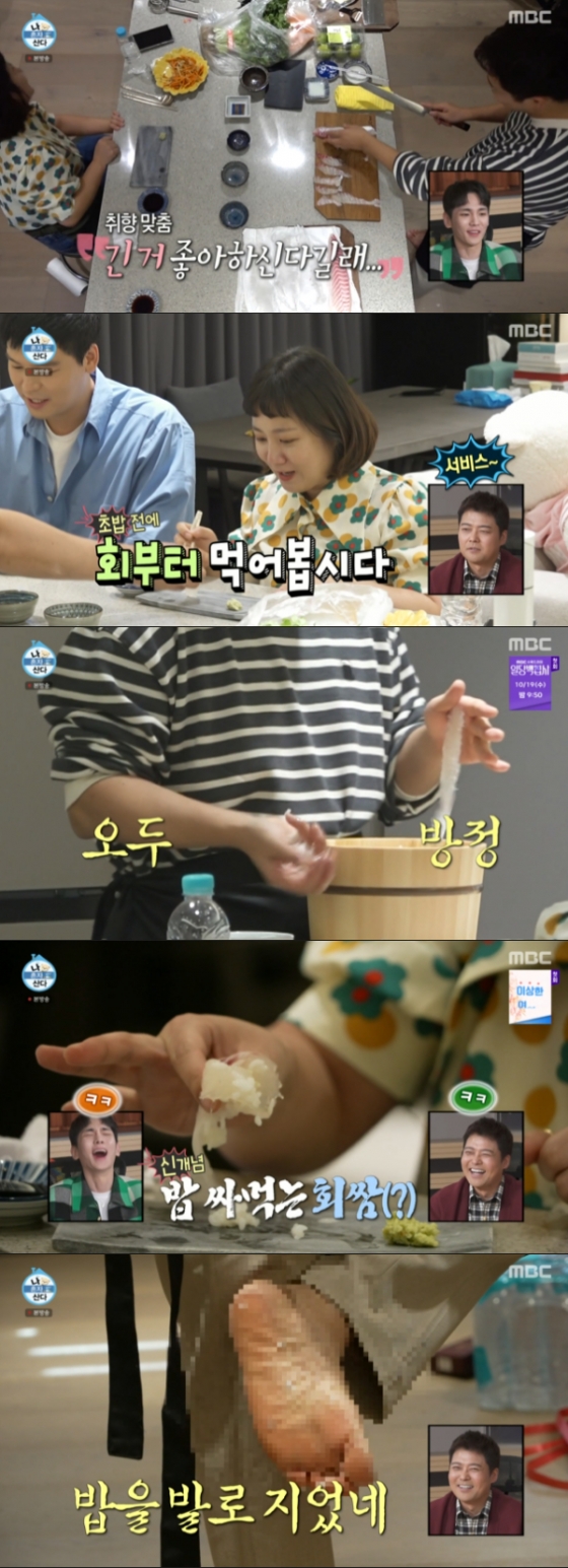 이후 전현무는 요란한 손동작으로 초밥 밥을 만들었다. 기안84는 "손에 더 많이 밥이 붙어있어"라고 말해 웃음을 안겼다. 박나래는 전현무가 자신의 개인 접시에 올려준 어설픈 초밥을 보고 "이게 뭐야"라며 웃었다. 박나래는 뭉쳐지지 않은 초밥에 폭소했다. 전현무는 초밥의 모양을 포기하고 회에 밥을 돌돌 말아 이장우 입에 넣어 웃음을 자아냈다. 이장우는 바닥에 있는 밥알을 발견하고 손가락으로 가리키며 "밥알 봐. 밥알"라며 폭소했다.