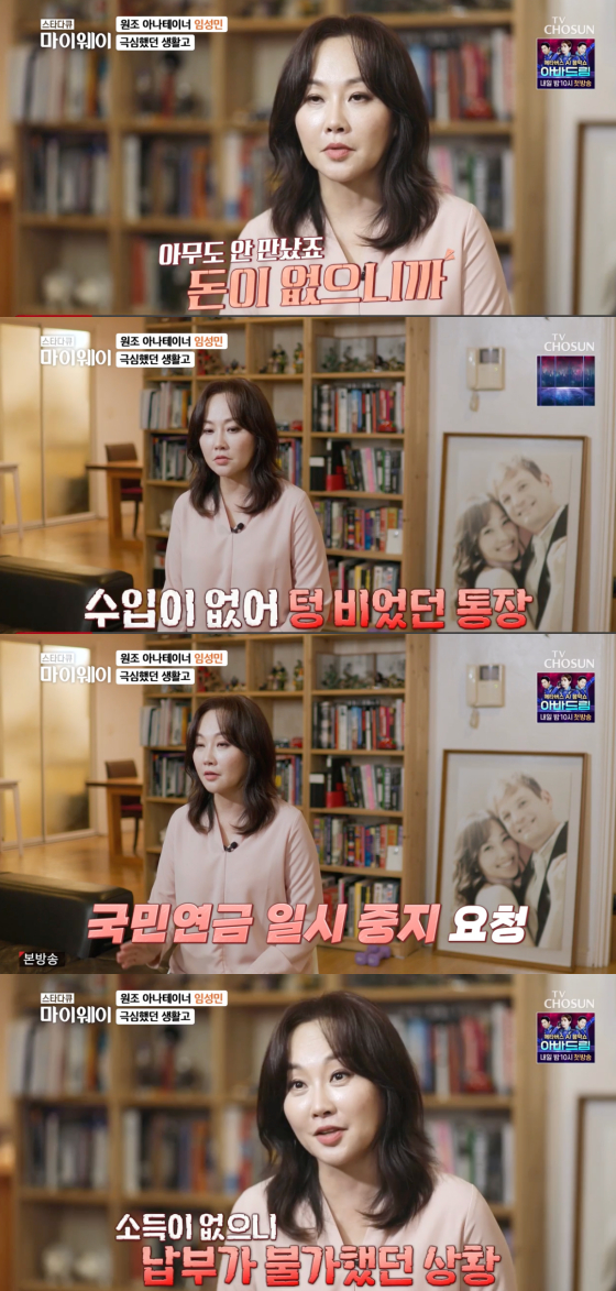 임성민은 "2005년에도 정말 일이 없었다. 당시는 아무도 안 만났다. 돈이 없으니까. 있었던 적금 다 깨고 의료보험, 국민연금도 못 냈다. 내라고 전화가 오면 솔직하게 못 내겠다고 얘기했다. 그렇게 얘기하니 (중지 요청을) 받아주더라"고 전해 눈길을 끌었다.