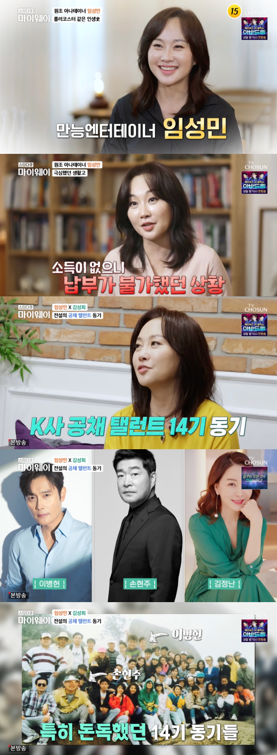 임성민은 또 과거 KBS 14기 공채 탤런트에 합격했던 경력이 있다고 전했다. 그녀는 14기 동기로는 이병헌, 손현주, 김정난, 김정균, 배도환, 노현희, 김하균, 김성희 등이 있다고 밝혀 놀라움을 자아냈다. 그 중 가장 친하다는 김성희는 "저희 기수가 아직도 동기 모임을 한다"며 "이병헌은 바빠서 못 나올 때 찬조금을 보내준다"고 전해 감탄을 더했다.