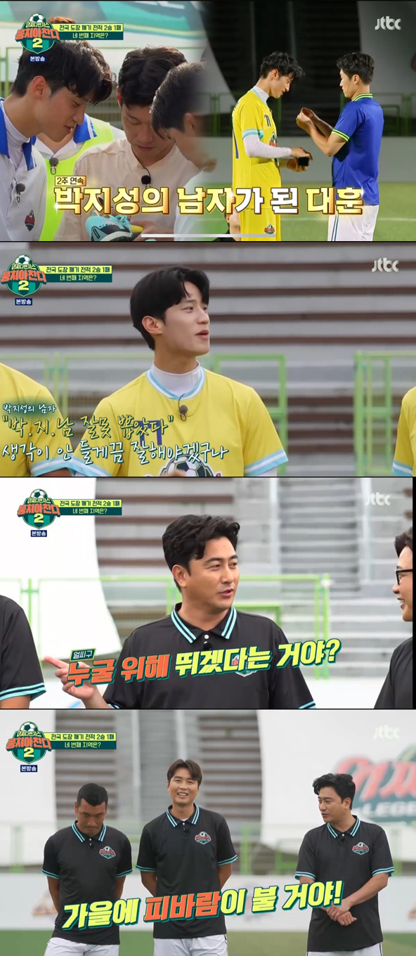 2일 방송된 JTBC '뭉쳐야 찬다 2'에서는 전국 도장 깨기 4탄을 일주일 앞둔 '어쩌다벤져스'에 긴급 용병이 투입됐다. 그 전 '어쩌다어벤져스팀'은 지난 박지성팀과의 경기를 되짚으며 사기를 다졌다.