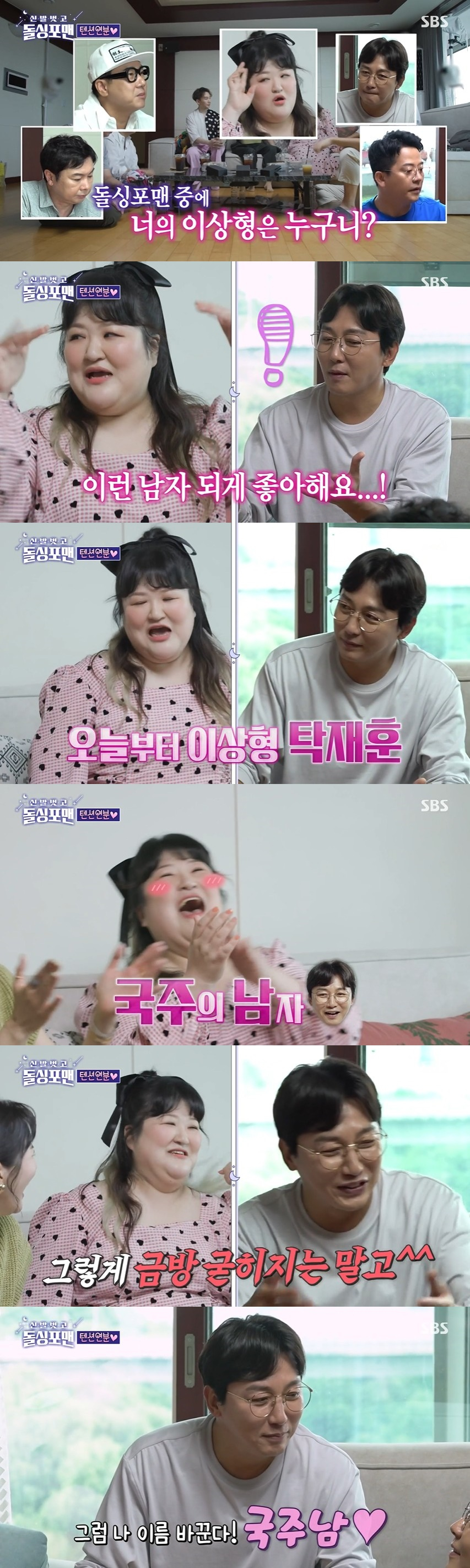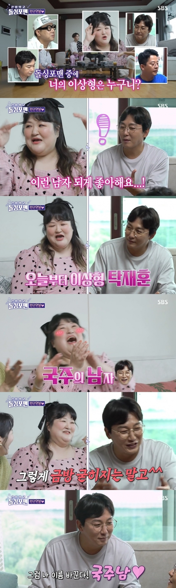 장영란은 "그럼 여기서 이상형이 재훈이 오빠냐"라고 물었고, 이국주는 "굳혀졌다. 이제 이상형 남주혁 아니야 탁재훈이야. 큰일 났네"라고 호들갑 떨었다. 탁재훈은 곤란해하며 "그렇게 너무 굳히지 말고"라며 말렸다.