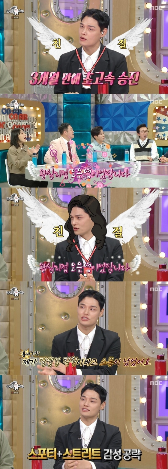 이어 정혁은 "친절 직원이라고 CS 상이라는 것이 있다. 보통 입사해서 올라가는데(승진하는데) 1년 이상 걸리는데, 3개월 만에 승진을 했다"라고 자랑했다. 이에 김구라는 "고속 승진했네"라며 감탄했다.