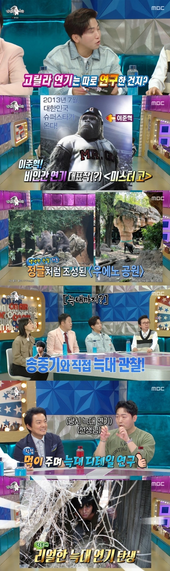 이준혁은 "그렇다. 우리나라 고릴라들은 잘 안 움직인다. 일본 우에노 공원에 가서 고릴라를 관찰했다. 움직이는 것과 소리 내는 걸 연구했다"라며 과거의 경험을 사려 실감 나는 고릴라 연기를 선보였다.