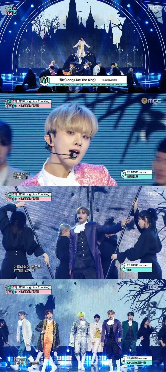 킹덤(훤, 자한, 단, 아서, 무진, 루이, 아이반)은 8일 오후 3시 15분 방송된 MBC '쇼! 음악중심'(이하 '음중')에서 미니 5집 타이틀곡 '백야(Long Live the King)' 컴백 무대를 꾸몄다.