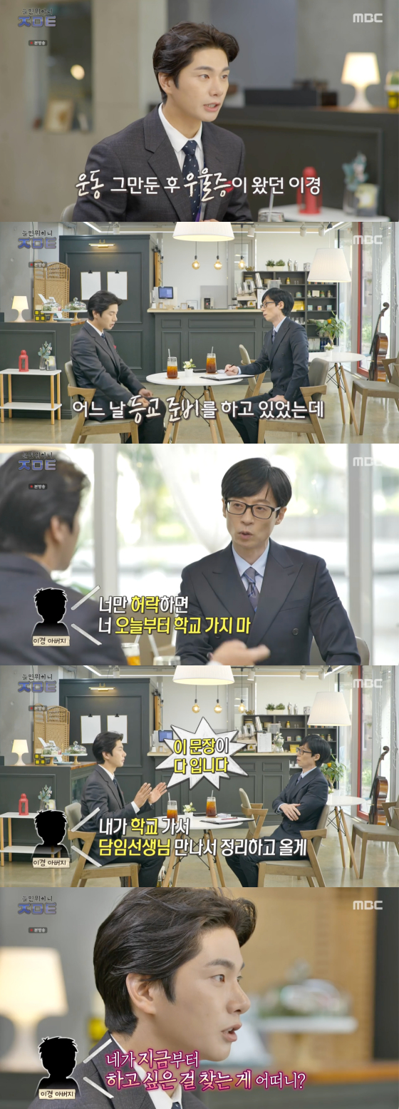이이경은 공수도를 어릴 때부터 하다 갑자기 그만두게 돼 우울증이 왔었다며 "근데 우울증인지 몰랐다. 언젠가 학교 가려고 양말을 신고 있는데 아버지가 '너만 괜찮으면 오늘부터 학교 가지마. 내가 선생님이랑 정리하고 올게'하셨다. 이게 다였다. 저는 학교 가지도 않았다"고 설명해 유재석을 감탄케 했다.