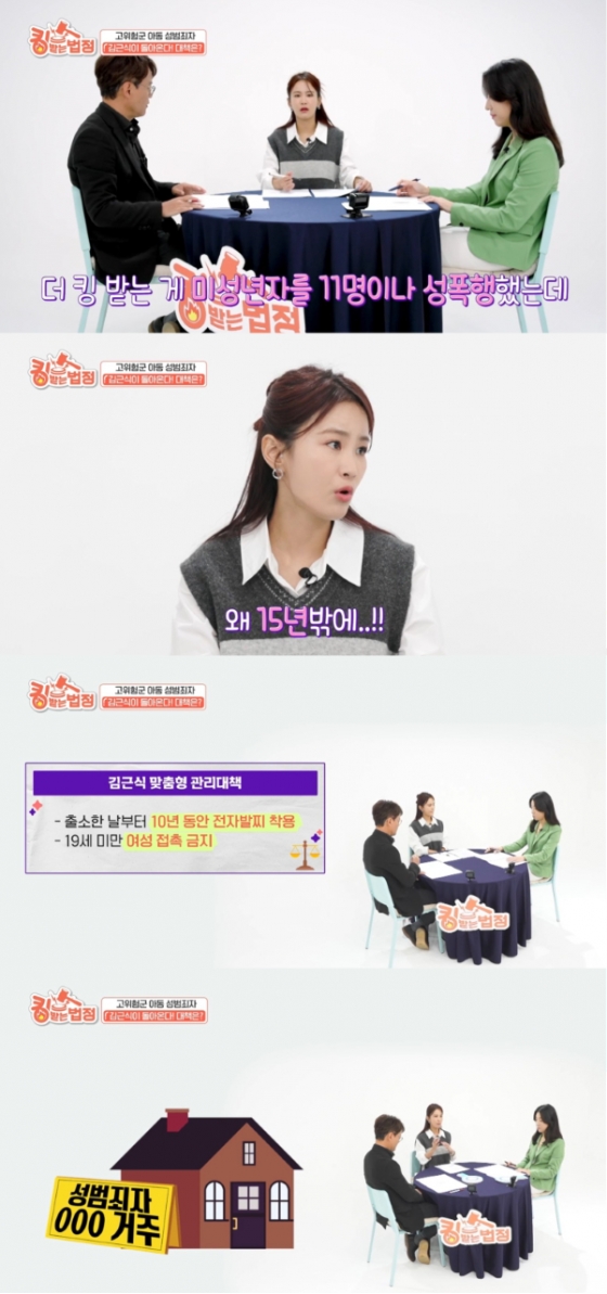 MC 김지민은 고정 패널인 동아일보 기자 출신 정혜진 변호사(IHQ 법무실장·상무), 판사 출신 신중권 변호사와 함께 아동 성범죄에 대한 이야기를 나눴다.