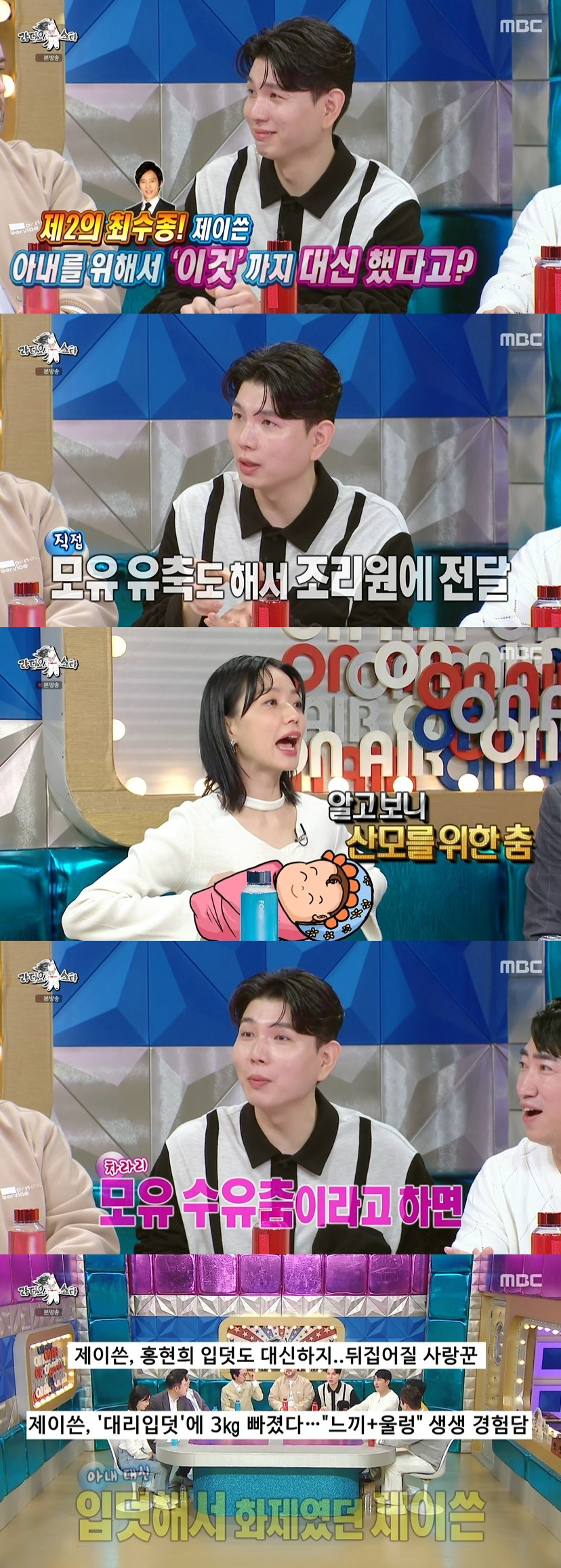 이어 제이쓴은 "저는 안영미씨한테 감사하다. 가슴 춤이 유방 울혈을 풀어준다고 하더라"라고 말했다. 이에 안영미는 "내 춤이 그렇다고 하더라고, 이게 마사지할 때 안영미 가슴 춤처럼 하라고 한다더라"라며 기뻐했다.