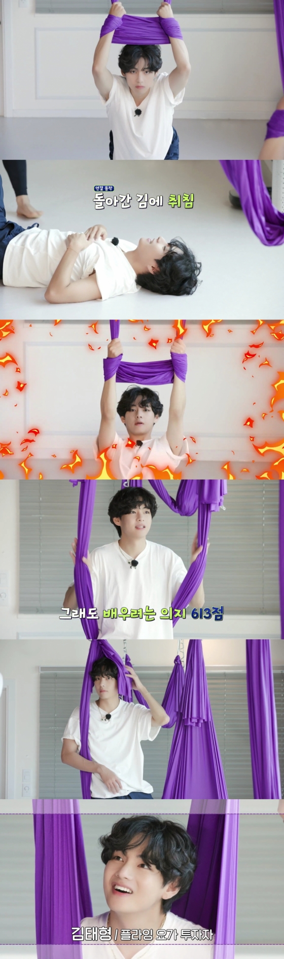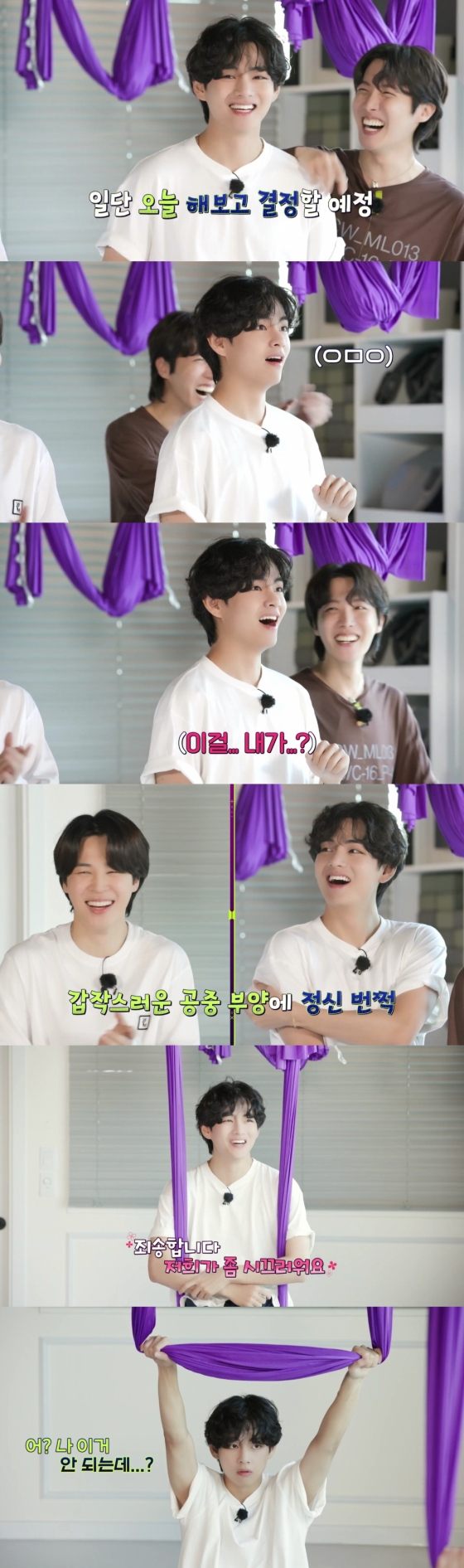 플라잉 요가 남자 강사가 강렬하게 등장해 시범을 보이자 뷔는 놀라움을 감추지 못하며 사랑스러운 표정을 지어 보였다.