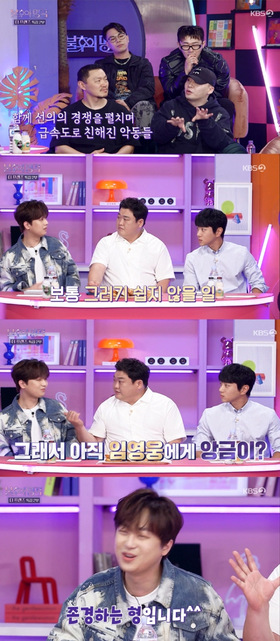 이를 들은 이찬원은 "경쟁상대로 붙어서 패하게 되면 그게 쉽지 않은데"라 했고, 이에 김준현은 "그래서 이찬원 씨가 아직도 임영웅 씨에 대한 앙금이 남아있잖아요"라고 덧붙여 이찬원을 당황스럽게 했다. 이찬원은 "그렇지 않아요. 얼마나 존경하고 좋아하는데요"라고 말하며 상황을 잘 마무리 지었다.