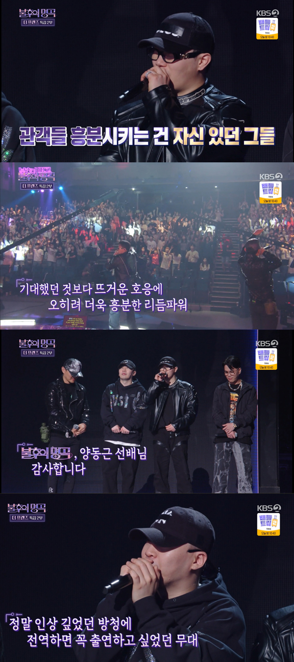 이에 리듬파워의 행주는 "힙합 곡으로 수많은 무대를 해봤어서 관객들 흥분시키는 건 자신있었다. 그런데 저희가 너무 신나고 흥분을 해서 호흡이 너무 힘들어지는 바람에 랩을 하기 힘들 정도였다"고 말했다. 그리고 "이 정도로 흥분되는 무대는 너무 오랜만이었다. 이런 무대를 만들어주신 여러분들과 '불후의 명곡' 그리고 양동근 선배님한테 진심으로 감사드립니다."라며 감사의 인사를 덧붙였다.