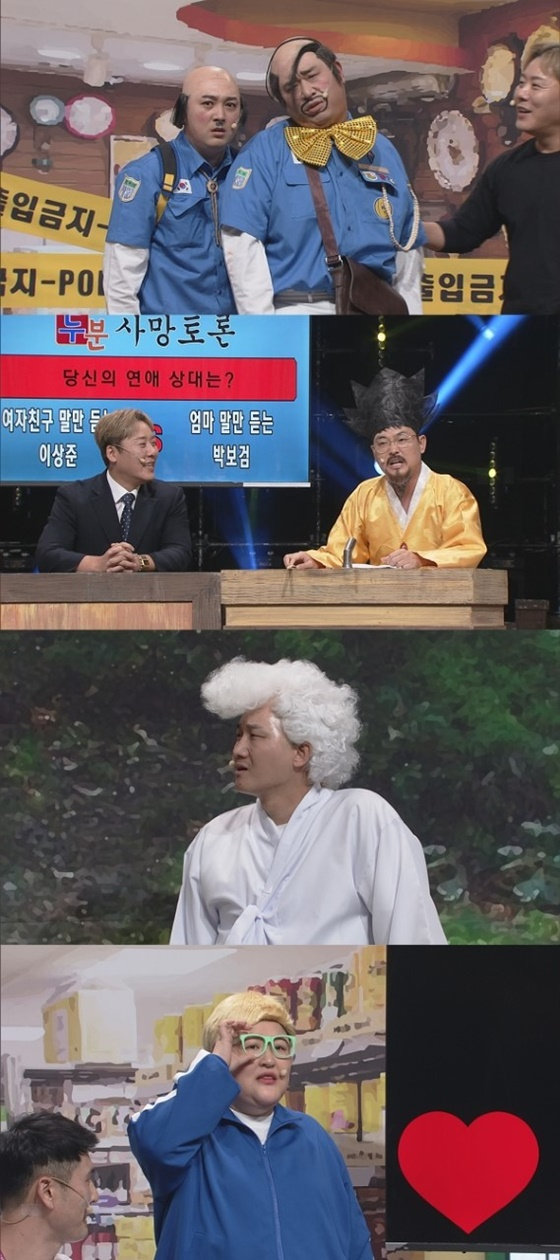 '결혼해 두목'에서는 이국주와 허영지의 화끈한 댄스 배틀이 펼쳐졌다. '전지적 조상 시점'에서 조상 이용진은 저승사자 정호철과 앙숙 케미스트리를 발산하며, '주마등'의 홍윤화는 41살 '부끄뚱' 문세윤의 실체를 폭로했다. '취향저격수'에서는 이은지가 방청객들의 격한 공감을 자아낸 회식 에피소드를 공개했다. 이날 오후 7시 45분 방송.