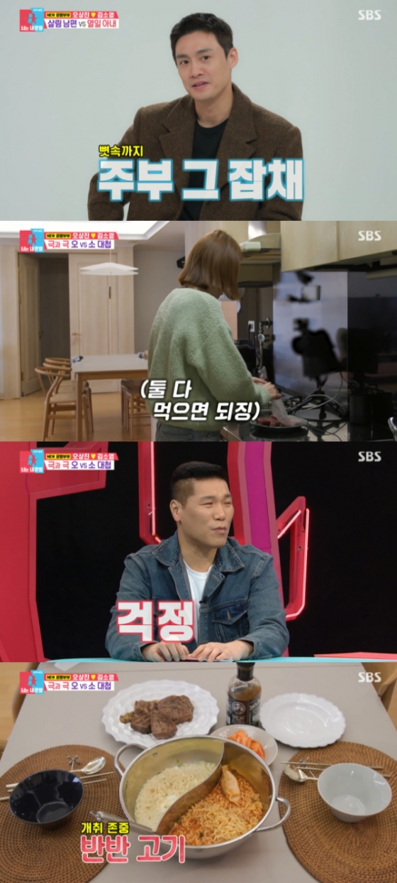 이날 김소영은 퇴근 후 오상진에게 "라면 먹고 싶었다"고 말했다. 오상진은 "음식 해놨는데"라며 실망했다. 김소영은 "뭘 했는데 봐 봐"라고 물었다. 오상진은 "고기 꺼내놨는데 미리 녹여놨지"라고 말했다. 김소영은 "고기랑 같이 먹으면 되겠네. 싫어?"라고 물었다. 오상진은 "저기 밥이랑 반찬이랑 먹을라 그랬지"라며 서운함을 내비쳤다.
