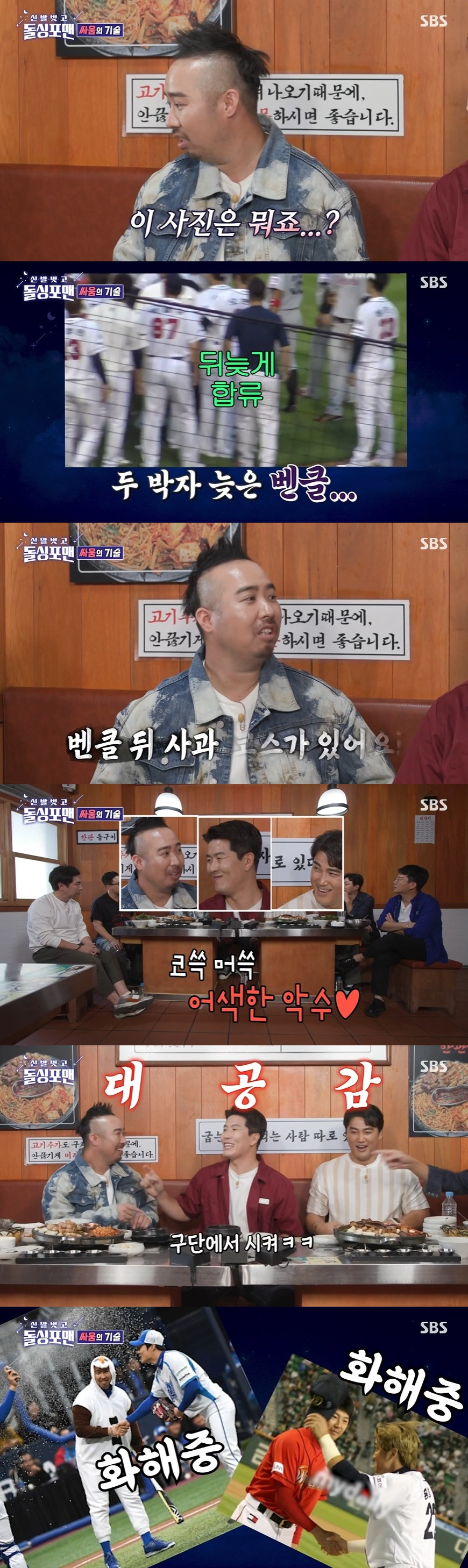 김병헌은 "맞아. 맞아. 구단에서 시켜"라며 손뼉을 쳤다. 유희관은 "왜냐면 우리 화해했다를 보여줘야 한다"라며 벤치클리어링의 뒷이야기를 공개했다.