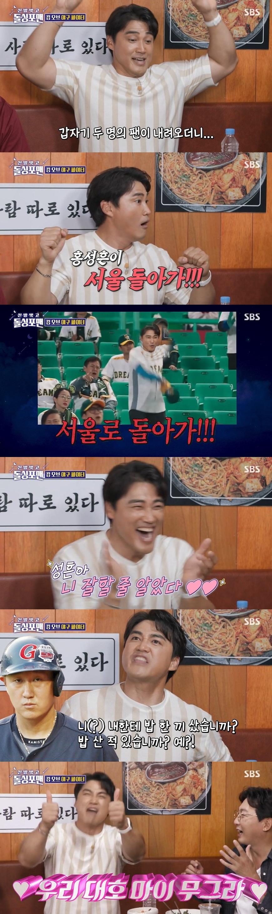 이어 홍성흔은 "갑자기 두 명의 팬이 내려오시더니 '야 이 개 XX야. 서울 돌아가' 이러시는 거다. 저도 열받는데 가족들도 와있어서 창피했다. 5월부터 기적적으로 (실적이) 살아났다. 근데 저는 욕했던 그분을 기억한다"라고 말해 멤버들이 또 한 번 폭소했다.