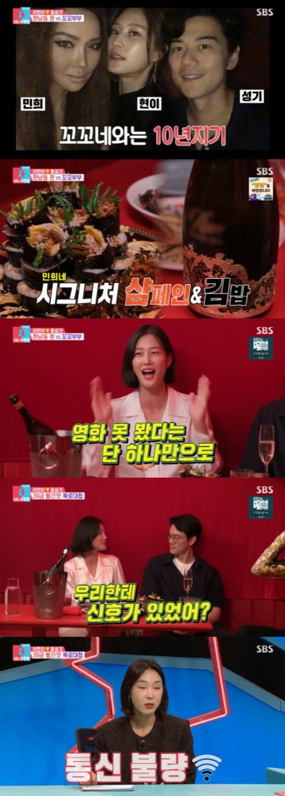 이후 한민희는 두 부부에 "너네들은 어떤 식으로 스킨십 자연스럽게 해?"라며 10년 차 부부의 스킨십에 대해 궁금해했다. 홍성기는 이현이를 보며 "신호는 있잖아"라고 말했다. 이현이는 "우리가 신호가 있어?"라고 물었다. 홍성기는 "아 나만 있는 거야?"라며 당황했다.