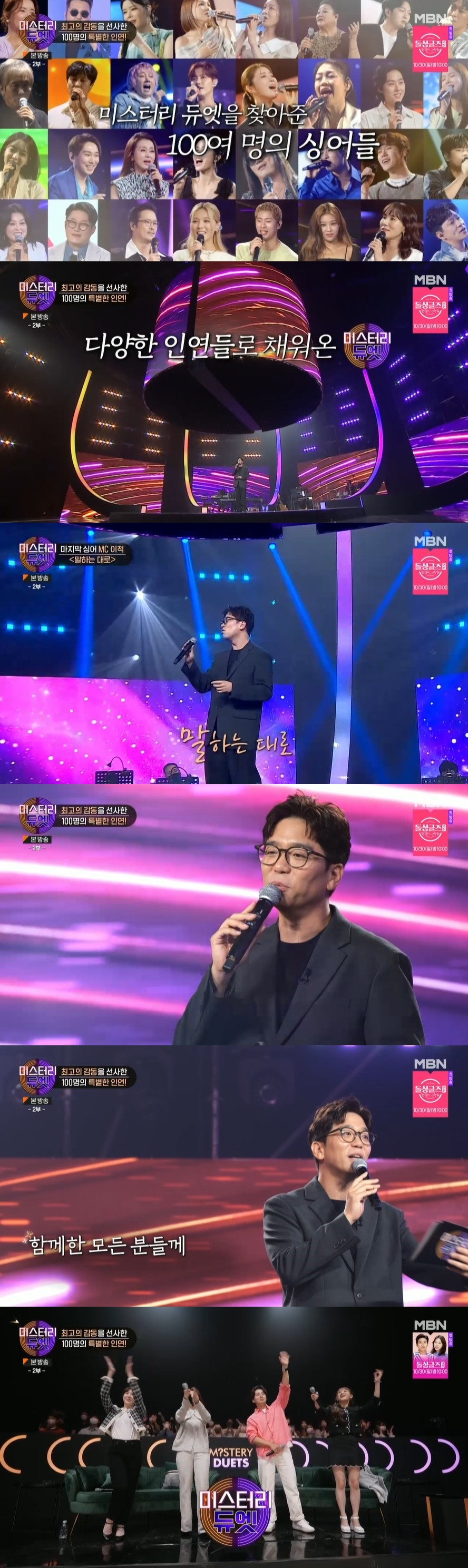 24일 오후 방송된 MBN 음악 예능 프로그램 '미스터리 듀엣'에서는 MC 이적이 듀엣 무대를 소개 후 마지막 인사를 전하는 모습이 담겼다.