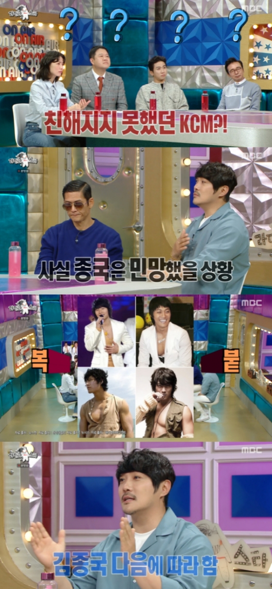 이날 KCM은 김종국과 예전에는 친하기 어려웠다고 전했다. KCM은 제작자 사장님, 김종국과 함께 노래방을 간 적이 있었다며 "사장님이 김종국에게 '너랑 똑같이 할 수 있다. 널 이길 거다'고 말해서 민망했다"고 전했다.