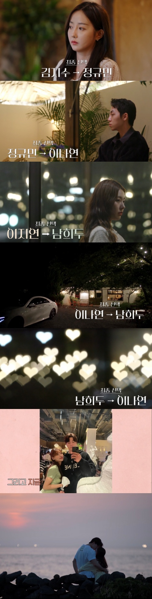 정규민은 'X' 성해은이 아닌 이나연을 선택했다. 이나연은 정규민에게 "내가 왜 맨날 오빠를 기다리게 하는 것 같지"라고 했다. 정규민은 "그러면 내리든가"라며 "우리 처음 만났을 때 사진을 골라서 몇 장 가져왔다. 내리면 주겠다. 상처를 안 받았다고 하면 거짓말이지만 그래도 계속 좋았다"라고 말했다. 이나연은 "진짜 고맙다. 내가 오빠를 만나면서 나 스스로 듣고 싶었던 말을 많이 들었다. 엄청 힘이 됐고 많이 컸다"라고 고마움을 전했다.