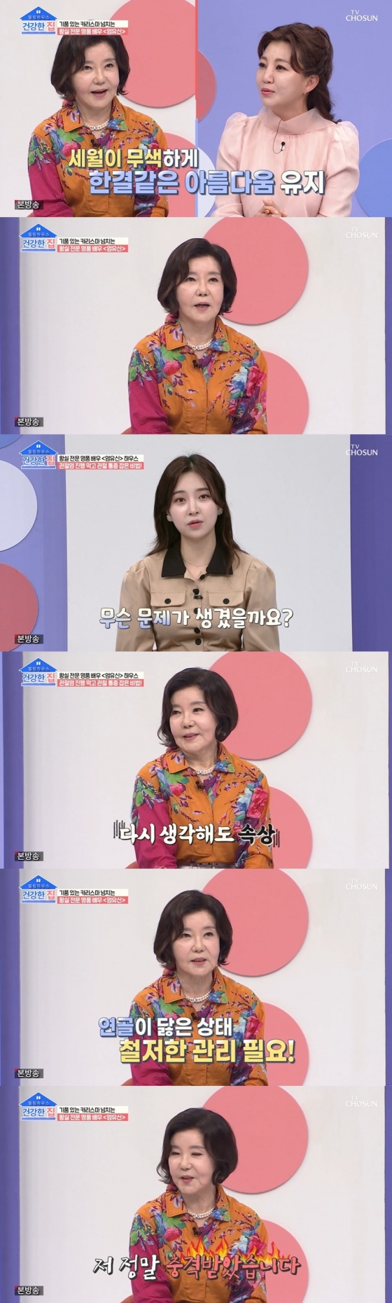 이날 52년 차 배우 엄유신은 '건강한 집'을 찾은 이유를 설명했다. 엄유신은 "아무래도 한해 한해 나이가 드니까 건강에 관심이 많아졌다. 그런데 갱년기 이후에 건강에 문제가 생겼다. 무릎도 시큰거리고 계단 내려가는 것도 힘들었다"라고 고백했다.