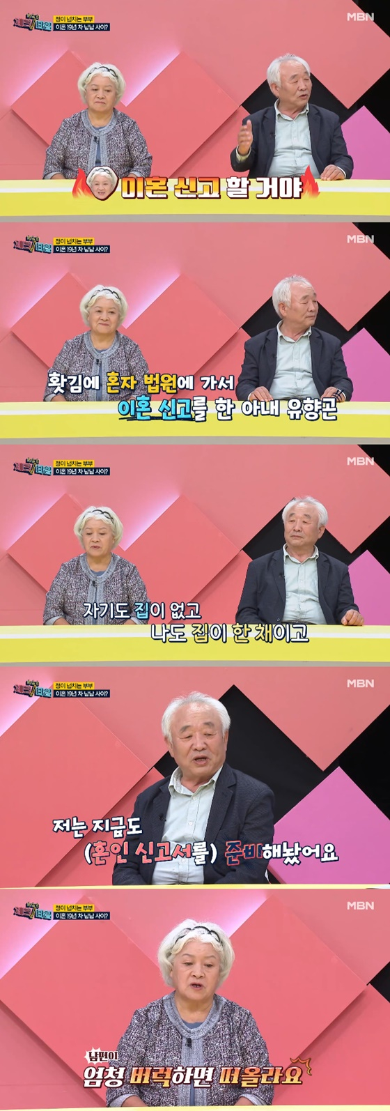 또한 이종구는 아내와의 재결합 의지를 밝혔다. 그는 "저는 지금도 (혼인신고서를) 준비해두고 있다"고 밝혔다. 반면 유향곤은 "평소엔 이혼한 것을 잊어먹고 산다. 그런데 남편이 버럭 하면 다시 떠오른다"며 "잊어버리니까 같이 같이 사는 것 같다"고 말했다.
