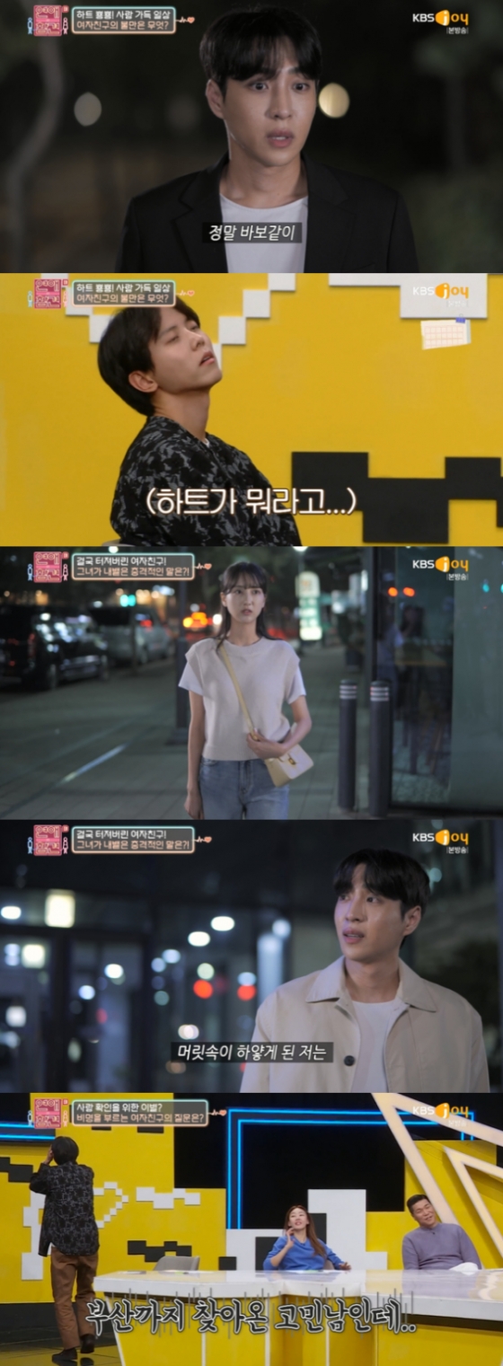 이후 여자친구는 고민남에 할 말이 있다며 머뭇거렸다. 고민남은 "무슨 일 있어?"라고 물었다. 여자친구는 "오빠 우리 헤어지자"라며 이별을 통보했다. 한혜진은 "저거는 '빨리 사랑한다고 얘기해 줘' 그거야"라며 여자의 마음을 알아챘다.