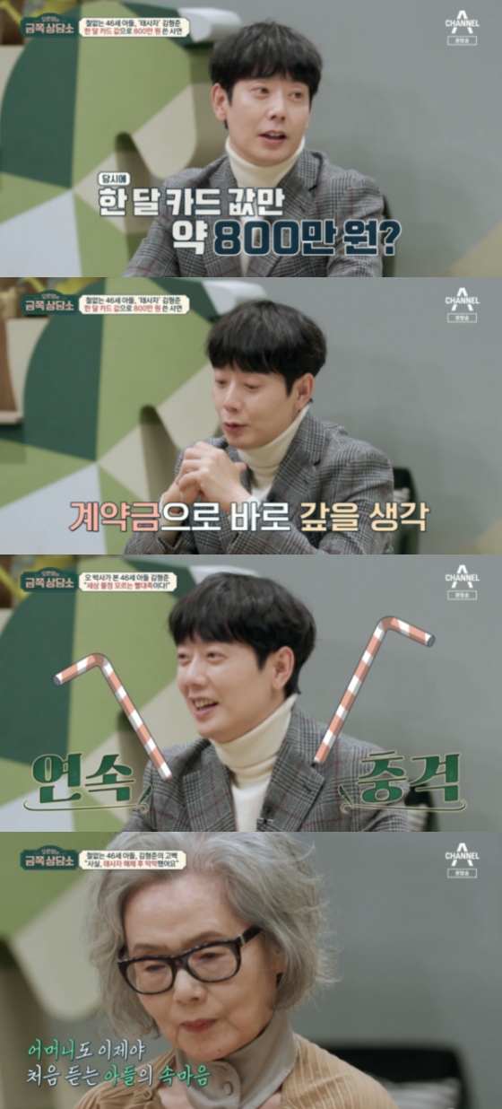 김형준은 "연기자 계약금을 믿고 아버지께 먼저 돈을 받아쓰고 갚을 생각이었다"며 "그 당시에 한 달에 800만 원 정도 썼다. 정말 철이 없었다"며 지난날을 후회했다. 김형준은 "어차피 '계약금이 나오니까'라며 갚을 생각이었는데 그게 물거품이 돼버렸다"고 털어놨다.