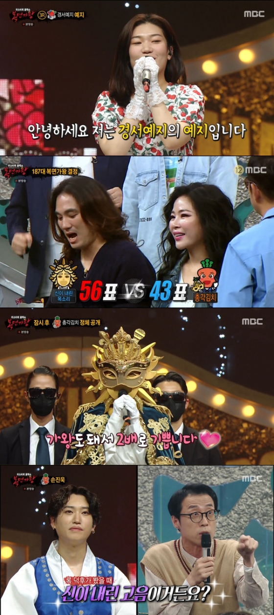 이어 진행된 '총각김치'는 가왕 방어전 무대로 조관우의 '늪'을 선곡했다. '총각김치'는 경이롭고 깜짝 놀라는고음으로 어려운 선곡임에도 완벽한 무대로 선보였다. 그러나 '신이 내린 목소리'에 56대 43으로 아쉽게 패하며 187대 복면 가왕의 자리를 '신이내린목소리'에게 건네주게 됐다. '신이내린 목소리'는 "제가 보여드린 모습도 보여드릴 수 있었고, 가왕도 될 수 있어서 2배로 기쁘다"라며 가왕이 된 소감을 전했다.