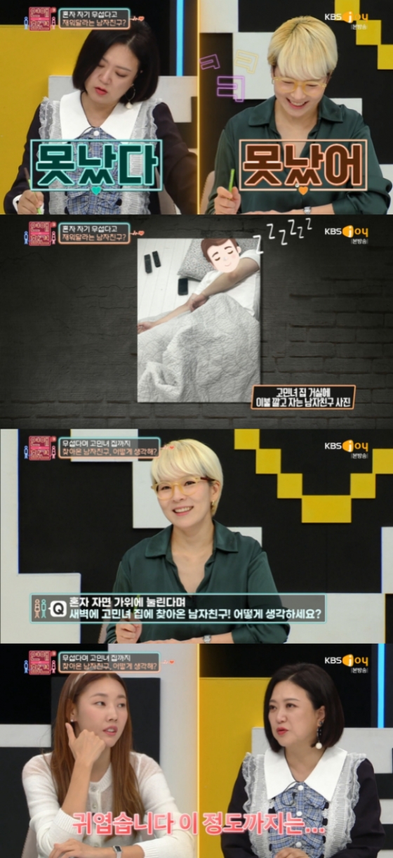 이날 서장훈과 한혜진이 고민녀의 사연을 읽었다. 고민녀의 남자친구는 자신의 집에 아무도 없자 두려움에 고민녀의 집으로 찾아가 재워달라며 사정했다. 남동생과 함께 살고 있는 고민녀는 곤란해했지만 '혼자 자면 가위에 눌린다'며 '남동생과 함께 자면 안 돼?'라는 제안에 결국 남자친구를 거실에서 재웠다.