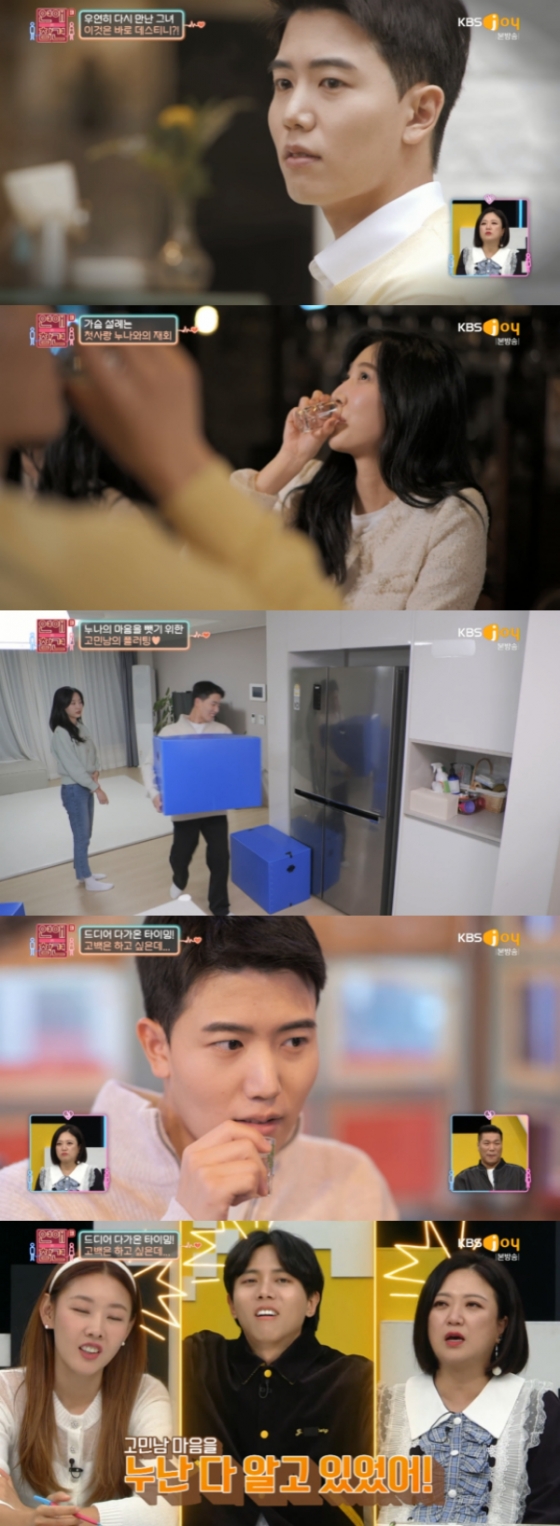 이날 고민남은 카페에서 우연히 첫사랑 누나를 발견하고 그리워했다. 고민남은 친구와의 술자리 중에서 화장실을 가려다 우연히 첫사랑 누나와 마주치게 됐고 지인들과 누나와 술을 함께 마시게 됐다. 고민남은 집을 구하고 있는 누나를 돕겠다며 누나와 가까워질 기회를 얻었다.
