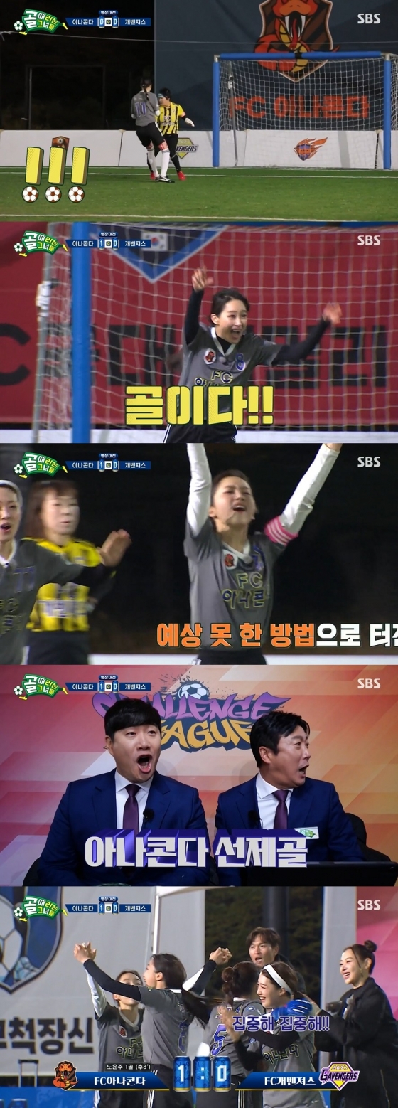 후반전 8분, FC개벤져스 골키퍼 조혜련과 대면한 FC아나콘다 노윤주가 선제골을 기록해 팀원들이 환호했다. 예상 못 했던 순간, 예상 못 한 방법으로 골을 달성한 노윤주는 상황을 파악 후 환호성을 질렀다.