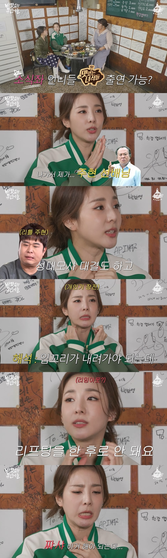산다라박은 입꼬리를 내리면서 '안 되나?"라며 "이게 이렇게 되어야 하는데, 리프팅을 한 후로 안 돼요. '짜샤' 이거 해야되는데"라는 말로 배우 주현 성대모사에 나섰다.