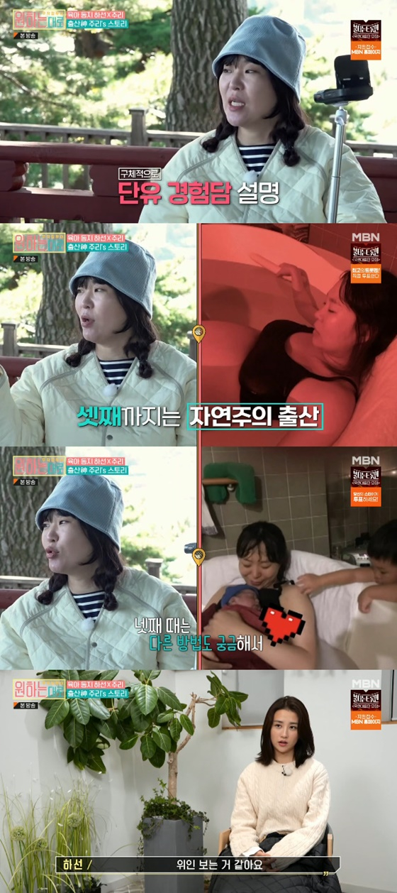 정주리는 출산에 대한 이야기도 전했다. 그는 "아이 넷 모두 자연분만했다. 셋째까지는 자연주의 출산이라고 수중 분만을 했다. 그런데 넷째 때는 다른 방법도 궁금해 자유분만을 했다"고 밝혔다.
