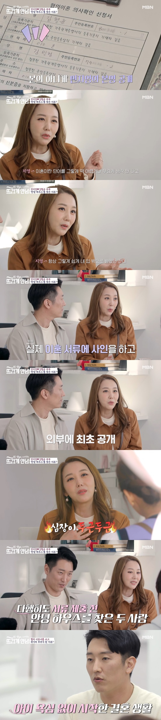 민지영 김형균 부부는 '하이바이 박스'에 협의이혼 신청서를 넣어었다. 민지영은 "지난 8월 달에 함께 논의 해서 이혼 신청서에 사인 했다"라고 털어놨다.
