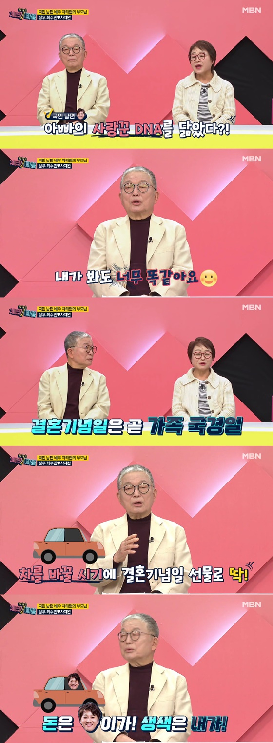 차재완과 최수민 부부에게 결혼기념일은 꼭 챙겨온 가족 행사라고. 차재완은 "국경일처럼 결혼기념일은 빠트리지 않는다"며 "올해에는 자동차가 필요해서 그 자리에서 샀다. 그런데 내가 산 게 아니라 차태현이 사 줬다"고 전했다.