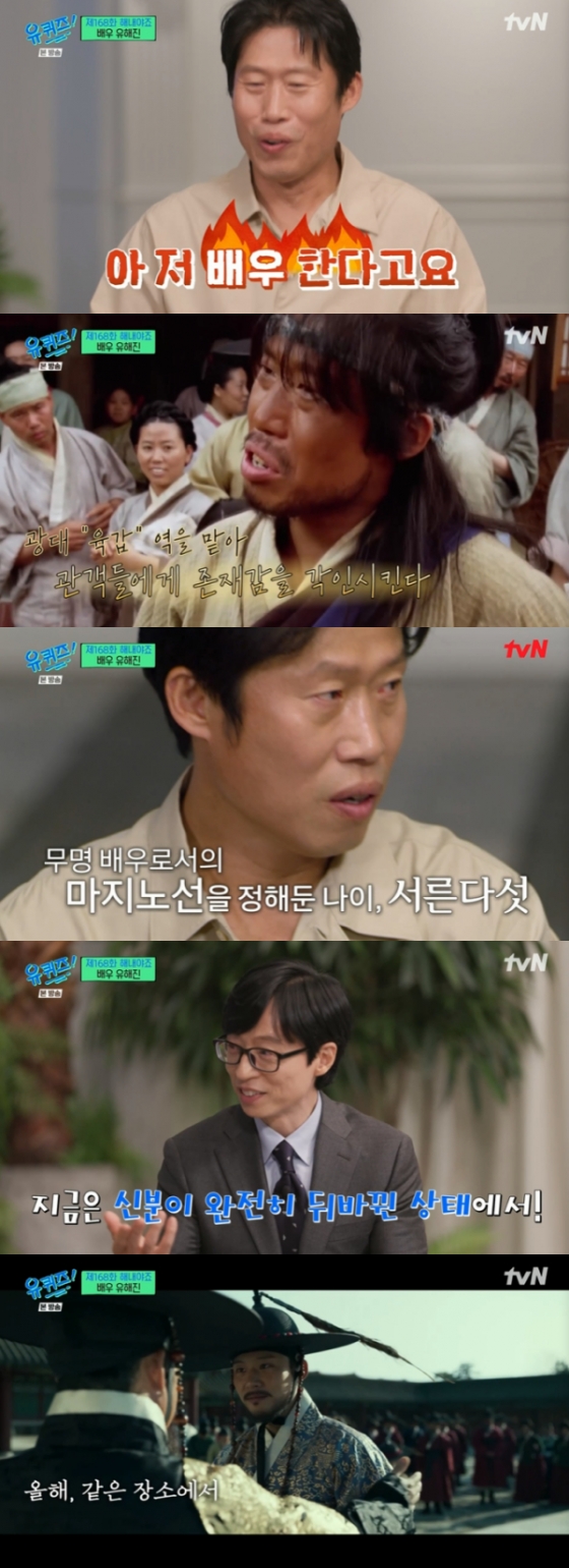 이후 유해진이 자리했다. 유재석은 유해진에게 "배우가 된다고 했을 때 반대를 많이 했다고 들었다"고 물었다. 유해진은 "그때는 반대할 만한 얼굴이었다. 꽃미남 위주의 얼굴 잘생겨야 됐다. 부모님뿐만 아니라 친구들도 많이 놀랐다"고 회상했다.