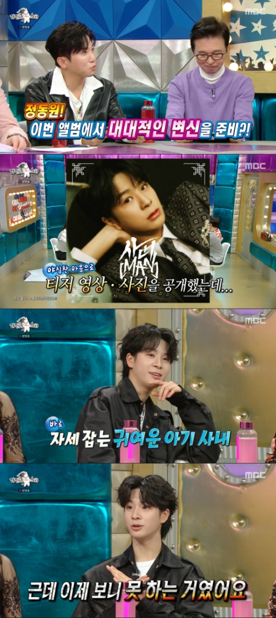 정동원은 "티저 영상을 공개했는데 댓글에 '남자가 되고 싶어 하는 아기다'면서 다 귀엽게만 봐주셔서 실망했다"라고 말해 귀여움을 자아냈다. 정동원은 MC들에 "좀 멋있어진 것 같지 않냐"고 물었다. MC 김국진은 "이제는 귀여운 게 싫냐"고 물었다. 정동원은 예전에 했던 귀여운 안무를 보면 현타가 온다고 털어놨다.