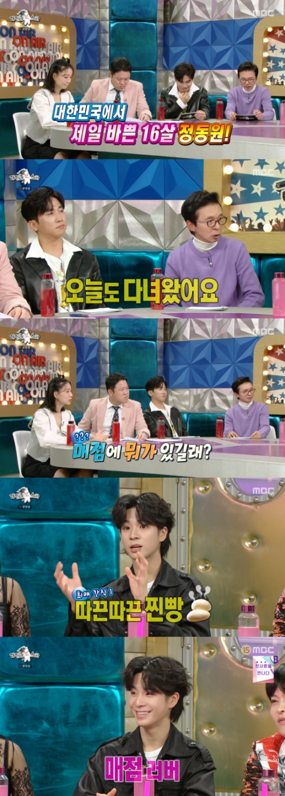 한편 정동원은 학교를 꼬박꼬박 가는 이유가 매점이라고 전했다. 정동원은 "매점이 있어서 꼭 간다. 다양한 맛의 찐빵이 있다. 그거 생각나서 꼭 간다. 삼각김밥도 많이 판다. 떡볶이랑 섞어서 먹고 한다"고 전했다. 김국진은 "학교게 더 맛있냐"고 물었다. 정동원은 "친구들이랑 먹는 거랑 다르다"고 설명했다.