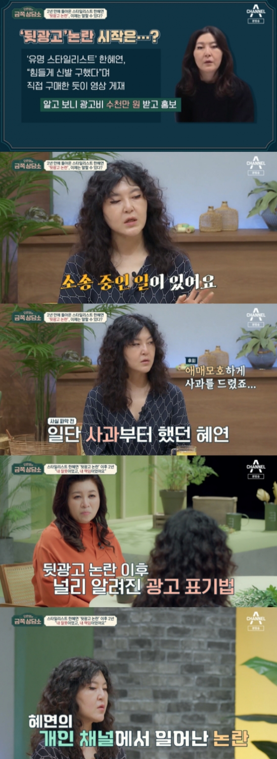 '금쪽상담소'에서 스타일리스트 한혜연이 뒷광고 논란에 대해 힘겹에 입을 열었다.