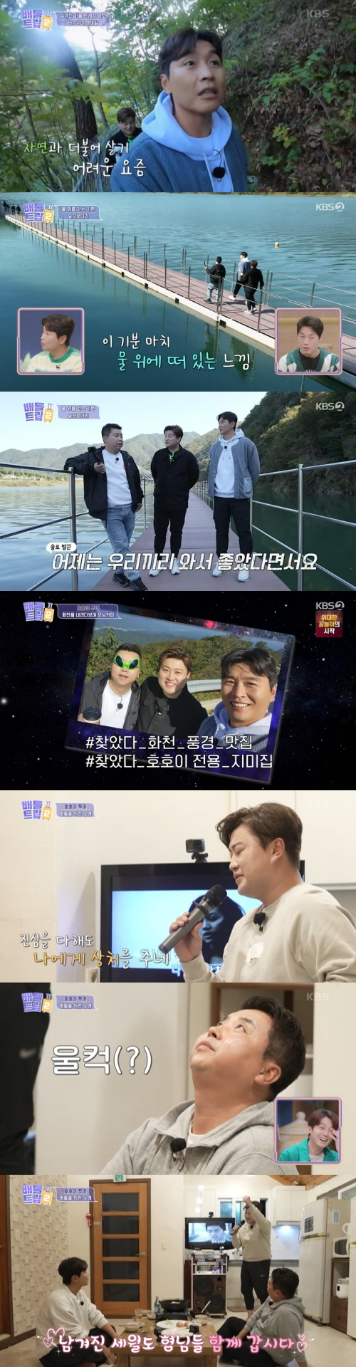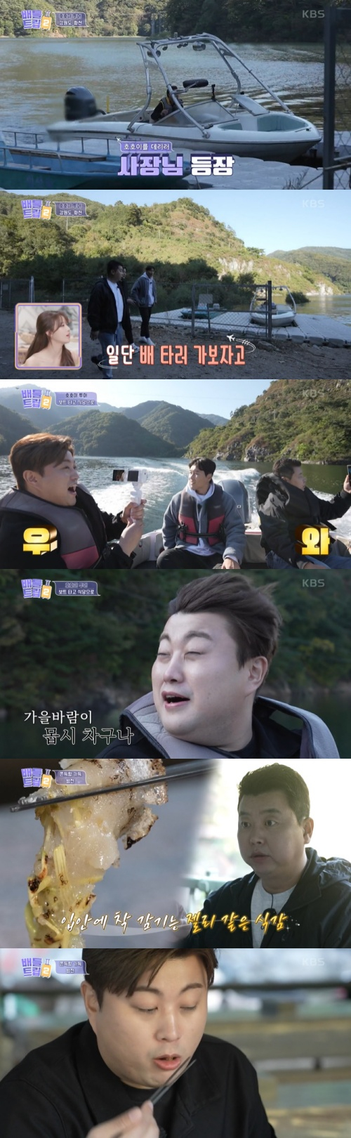 내비게이션대로 식당을 찾아온 세 사람은 식당 사장에게 연락을 했다. 이후 강에서 모터 보트가 등장했다. 육지 안의 섬에 놀란 세 사람은 모터보트를 타고 출발하자마자 그림 같은 절경에 감탄사가 터져 나왔다. 세 사람은 파로호 상류를 따라 보트를 타고 마을로 이동했다. 보트 속도가 빨라지자 김호중은 "밥을 이렇게 스펙터클하게 먹어본 건 처음이다. 형들이랑 효도 관광오니 좋다"라고 말하며 바람에 일그러진 얼굴로 웃음을 자아냈다.
