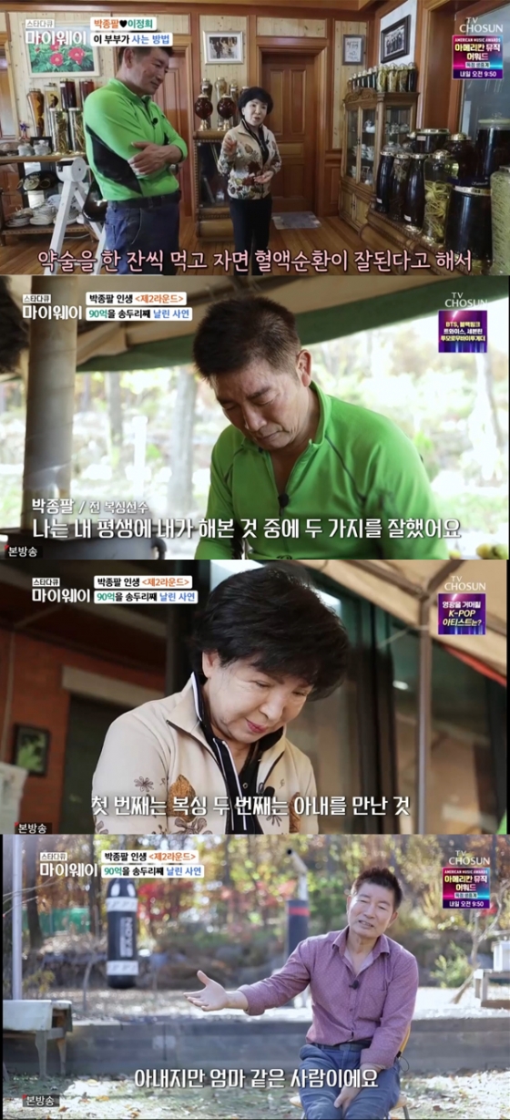 이 박종팔은 자신의 집에 있는 약술 500병을 공개했다. 박종팔 아내 이정희는 "남편이 몸이 안 좋았다. 눈도 떨리고 혈액순환이 안돼서 몸에서 냄새도 나고 사람이 되게 무기력했다. 약술을 한 잔씩 먹고 자면 혈액순환이 잘 된다고 해서 남편을 위해 담금주를 준비하기 시작했다"라며 남편에 대한 애정을 보여줬다.