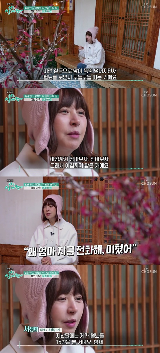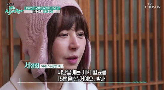 이날 서정희는 "지난달에는 혈뇨를 밤새 15번을 봤다. '이게 나의 죽음을 암시하는 건가? 그렇다면 나는 빨리 짐을 정리해야 하는데 어떻게 하지. 짐이 넌무 많아서 딸 (서)동주가 혼자 정리를 못할 텐데. 병원에서 영영 못 돌아오면 어떻게 하지' 이런 갈등으로 땀이 뚝뚝 떨어지고, 부들부들 떨면서 혈뇨를 본 거다"고 밝혔다.