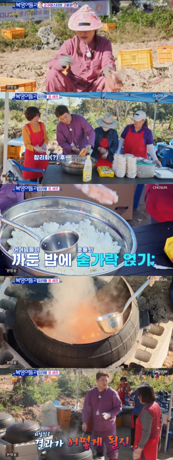 특히 김호중은 양념도 직접 제조하며 정성을 보였다. 김호중은 팔팔 끓는 가마솥을 보며 "저도 이렇게 많이 해본 적이 없어요"라며 자신 없어 했다. 김호중은 "20인분은 해봤는데 100인분은 처음인데 쉽지 않다"고 전했다.