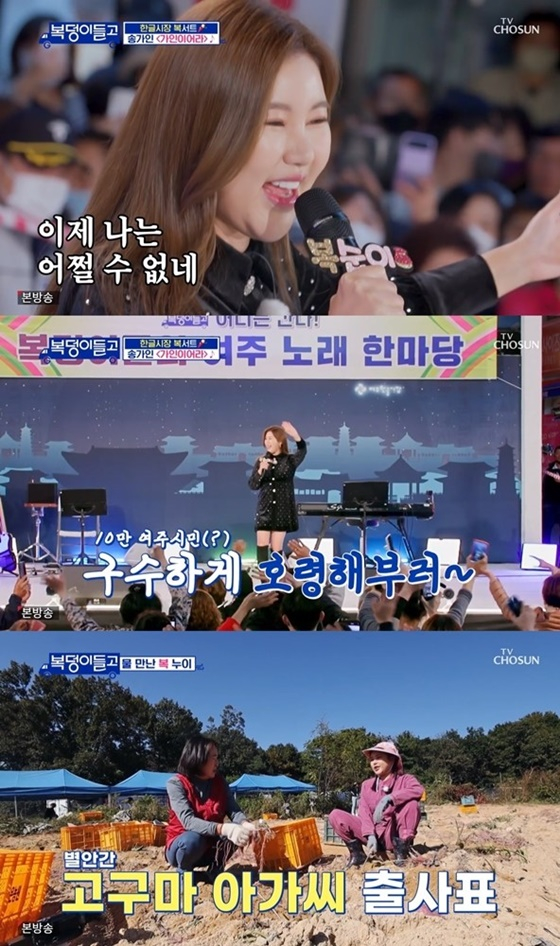 또한 '개나리 처녀'를 열창해 분위기를 끌어올린 송가인은 고구마밭에서 만난 부부와 깊은 대화를 나누는 등 남다른 소통력을 선보였다.
