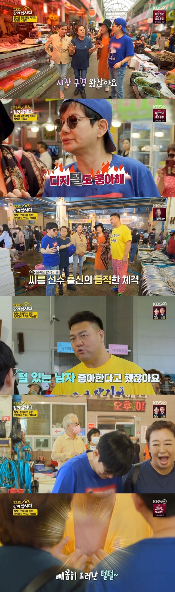 털털한 가이드 백승일을 본 안문숙은 "일단 1차는 합격. 일단 풍채가 좋다. 키도 크고 뭐든지 품을 수 있지 않냐"라고 호감을 보였다. 이에 백승일은 "더 좋은 건 뭔지 아냐. 누님이 털 있는 남자를 좋아한다고 하지 않았냐. 그 취향 아직 안 변하셨냐"라고 물었다.
